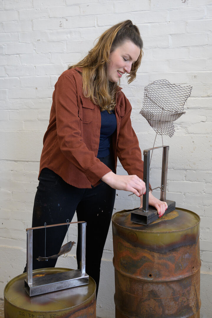 Manouk: In mijn sculpturen streef ik naar het vangen van beweging en het creëren van een ervaring voor degene die er letterlijk en figuurlijk mee in aanraking komt. Ik vind inspiratie in kinetische kunst, waar beweging en vorm samenkomen om een verhaal te vertellen. In mijn boekenkast vind je boeken van Jean Tinguely die me op de academie erg verraste met zijn speelse fonteinen. Ook Anthony Howe's werken verbazen me elke keer weer. Met precisie transformeert hij materialen tot hypnotiserende sculpturen die dansen op de wind. Deze invloeden zijn soms terug te zien in mijn eigen sculpturen,